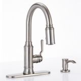 Pfister cagney one handle pull down kitchen faucet with soap dispenser the pfister cagney with soap dispenser is a great pull down faucet and the coordinating soap dispenser is both beautiful and convenient.
