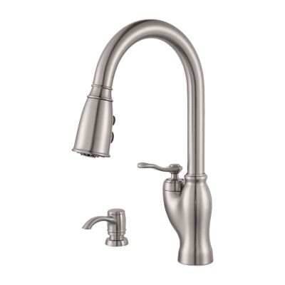 Ladera single handle pull down sprayer kitchen faucet with soap dispenser in spot defense stainless steel.