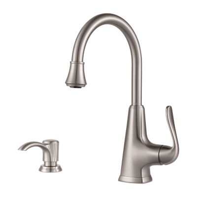 Pfister cagney one handle pull down kitchen faucet with soap dispenser the pfister cagney with soap dispenser is a great pull down faucet and the coordinating soap dispenser is both beautiful and convenient.
