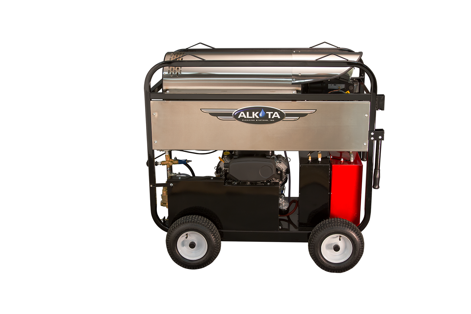 Pressure washer burners powder coated frames stainless steel coil wrap schedule 80 coil adjustable thermostat high limit over temp protection safety pop off over pressure protection 9 gallon fuel tank on diesel models inline flow switch 35 foot cord with gfci on 115 volt models 10 pneumatic tires on portable model.