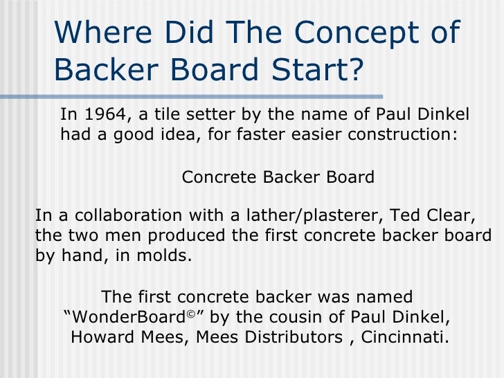 Concrete backer board in a collaboration with a lather plasterer ted clear the two men produced the first concrete backer board by hand in molds.